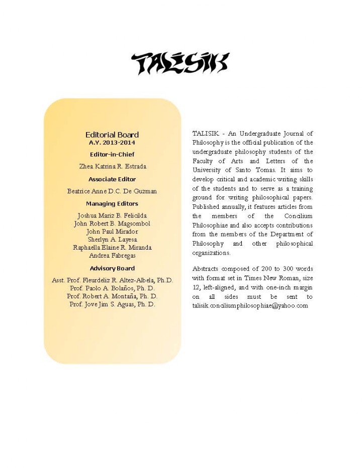 Congratulations to the Concilium Philosophiae, to the staff and advisers of TALISIK, to those who submitted their papers, and to everyone who willingly offered help for the success of the journal. To the succeeding staff of TALISIK, may you be able to continue this legacy and with high hopes, to surpass what has been made and improve what is lacking. And no matter how tough the going becomes, do not give up and always remember the words of the Venerable Master, “Come equal to the task before your eyes.”