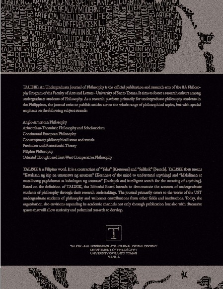 The cover illustrates the plurality and attributes of contemporary culture. The map illustrates the plurality of ideas discussed in this issue, while the words that compose the map represent the different attributes of contemporary culture from which each contribution critically engages with. TALISIK, as an undergraduate journal of philosophy, aims to contribute to existing discourses and exchange of ideas particularly concerning the contemporary world.